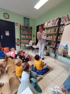 Chaque mois les élèves de l’école se rendent à la bibliothèque provinciale d’Erezée. C’est une bénévole qui nous accueille et nous lit de très belles histoires de la bibliothèque. Pendant ce temps, les institutrices choisissent des albums ainsi que des jeux pour l’école. Cette année, c’est Madame Annette qui nous accueille, étant une ancienne enseignante de langues, elle en profite pour nous apprendre quelques mots d’anglais.