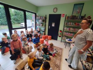 Chaque mois les élèves de l’école se rendent à la bibliothèque provinciale d’Erezée. C’est une bénévole qui nous accueille et nous lit de très belles histoires de la bibliothèque. Pendant ce temps, les institutrices choisissent des albums ainsi que des jeux pour l’école. Cette année, c’est Madame Annette qui nous accueille, étant une ancienne enseignante de langues, elle en profite pour nous apprendre quelques mots d’anglais.
