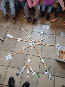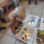 Après cette exposition, nous avons eu l’idée de nous aussi faire une collection. La lecture de l’album sur la pierre qui se baladait nous a donné l’idée de faire la même chose. Une fois notre pierre décorée, nous sommes parties en école les déposer dans le village.