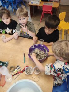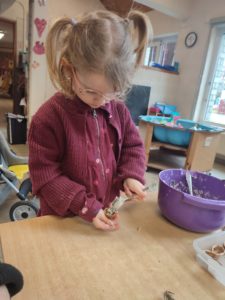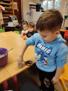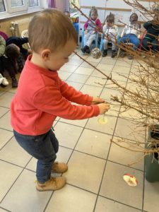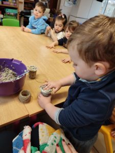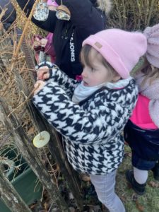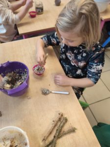 C’est l’hiver : Pour venir en aide aux oiseaux pendant ces périodes de gel et de froid, les enfants de maternelle ont réalisé des boules de graisse. Nous sommes ensuite allées les déposer aux abords de l’école