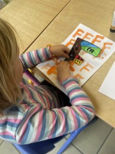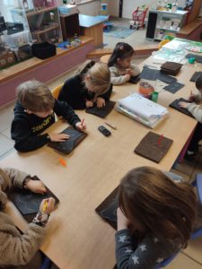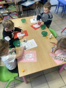 Puis nous avons ensuite réalisé nos propres cartes avec la technique artistique « du gobelet », nous sommes entraînés à écrire quelques mots à l’aide d’un référentiel. Puis nous avons déposé nos cartes comme le facteur dans les boîtes aux lettres de nos voisins. En ce qui concerne les personnes qui habitaient plus loin, nous nous sommes rendus à la poste pour y acheter des timbres.
